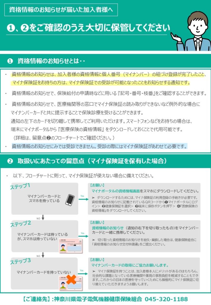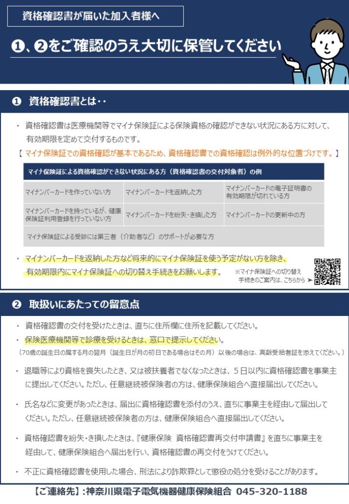 「資格確認書」および「資格情報のお知らせ」が交付された方へのリーフレットを添付いたしますので、適宜加入者の皆様へお知らせいただきますようお願いいたします。